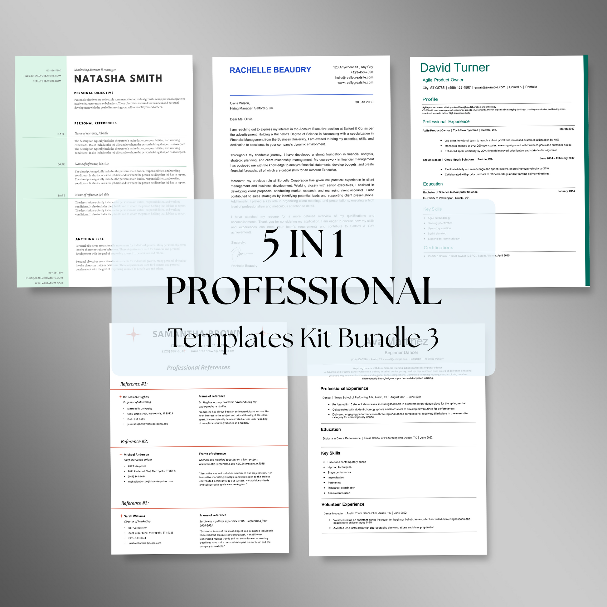 5-in-1 Resume & Cover Letter Bundle | Marketing, Product Owner, Dancer & Executive Templates
